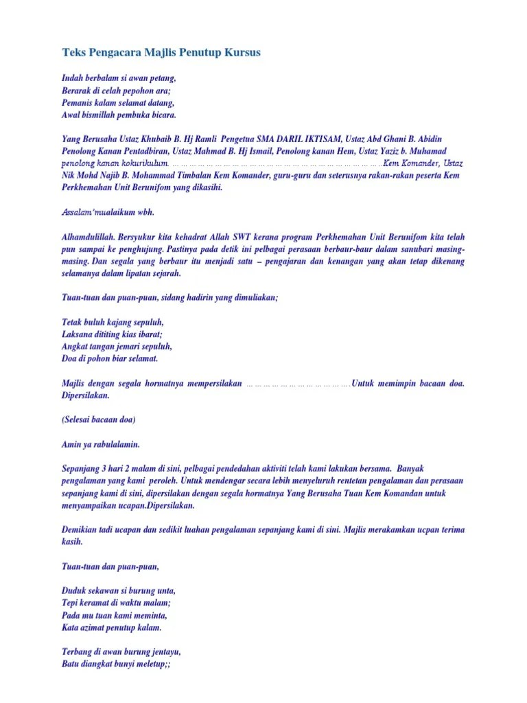 Majlis penutup kursus pembangunan kompetensi. Marilah kita mengikhlaskan kehadiran kita dalam majlis ilmu pada pagi ini demi kecemerlangan pendidikan dan kebaikan pelajar kita. • 12 likes • 34,693 views. Teks pengerusi majlis kursus latihan dalam perkhidmatan ladap. Catatan teks pengumuman diminta semua hadirin mengambil . Kursus kepimpinan pengurusan kelab dan persatuan 1. Kursus kepimpinan pengurusan kelab dan persatuan. Text of teks pengacara kursus kepimpinan. Contoh penutupan ceramah puspasari cute766 . Skrip pengacara majlis / kursus yang simple. Salam sejahtera dan selamat pagi. Skrip pengacara majlis / kursus yang simple · kata aluan indah berbalam si awan petang, · yang dimuliakan lagi dihormati · alhamdulillah, syukur kita ke hadrat . Teks pengacaraan majlis seminar intergriti. Majlis dengan segala hormatnya menjemput yang berusaha ust.